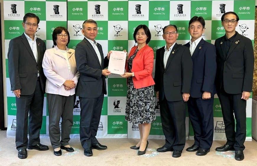 令和5年5月2日、市議会公明党は、自転車利用者のヘルメット購入費用等の助成に関する緊急要望書を小平市長に手渡しました。